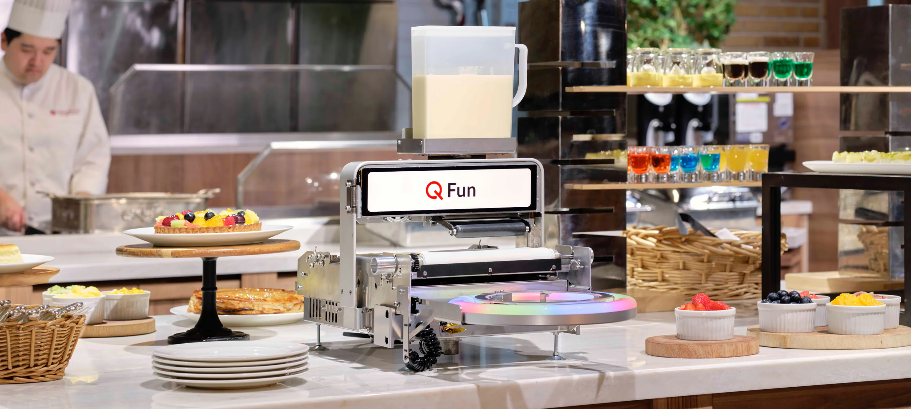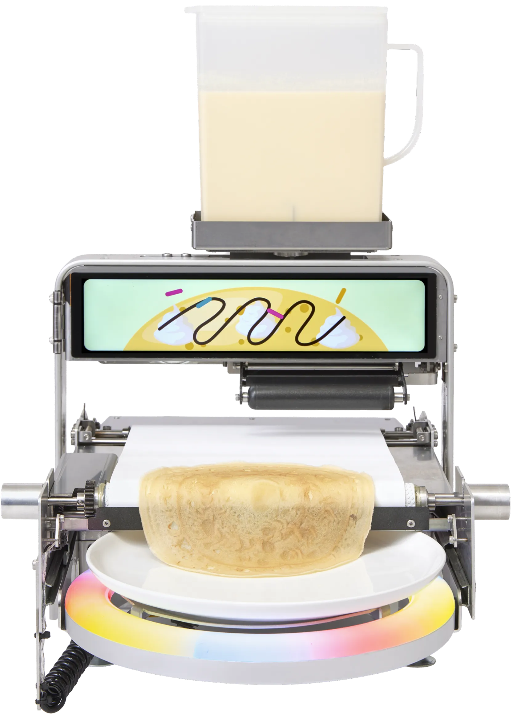 生地を流し込み、のばし、焼き上げる一連の調理工程を自動で行い、その様子を間近で楽しめる体験型の調理ロボットです。
